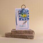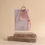 Μπομπονιέρα μπρελόκ σε εκτυπωμένο plexiglass πάνω σε χάρτινη βάση με εκτύπωση το όνομα του παιδιού.