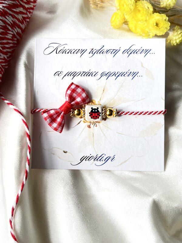 Ένα γλυκό μαρτάκι βραχιόλι με ζωγραφισμένη κεραμική χάντρα, πάνω στην οποία κάθεται μια χαριτωμένη πασχαλίτσα. Ο κόκκινο-λευκός καρό φιόγκος συνδυάζεται αρμονικά με το κορδόνι του Μάρτη, ενώ οι χρυσές λεπτομέρειες χαρίζουν μια διακριτική λάμψη στον καρπό. Ένα φωτεινό και παιχνιδιάρικο σχέδιο, ιδανικό για να φέρει χαμόγελο και τύχη !